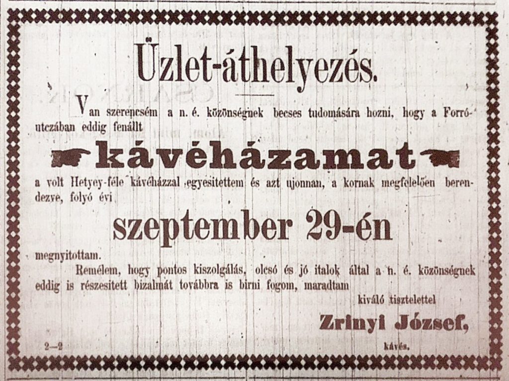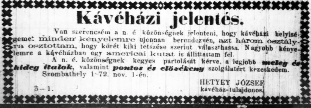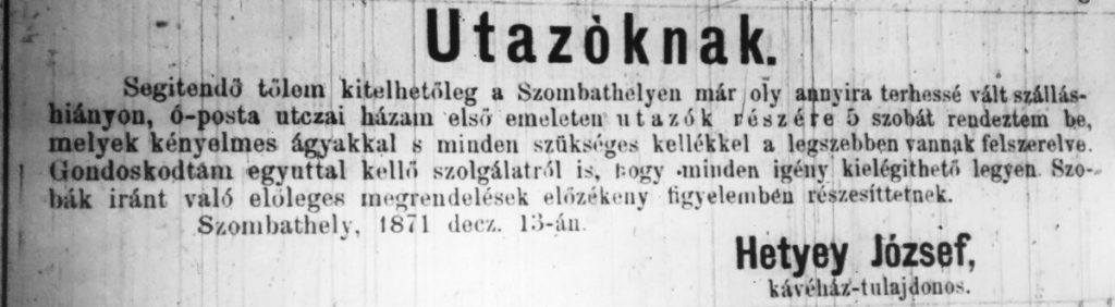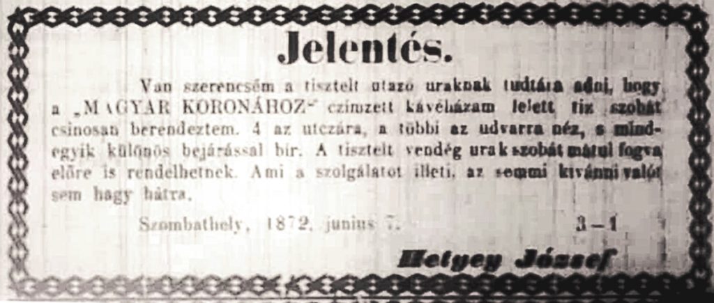 5 szobáját kávéháza mellé, utazók számára ajánlja, és hogy döntése jónak bizonyult, azt 1872-es hirdetése bizonyítja, melyben látható a szálló bővítése, immár nevesítve: kávéházát és szállóját a „Magyar Koronához” címzi.