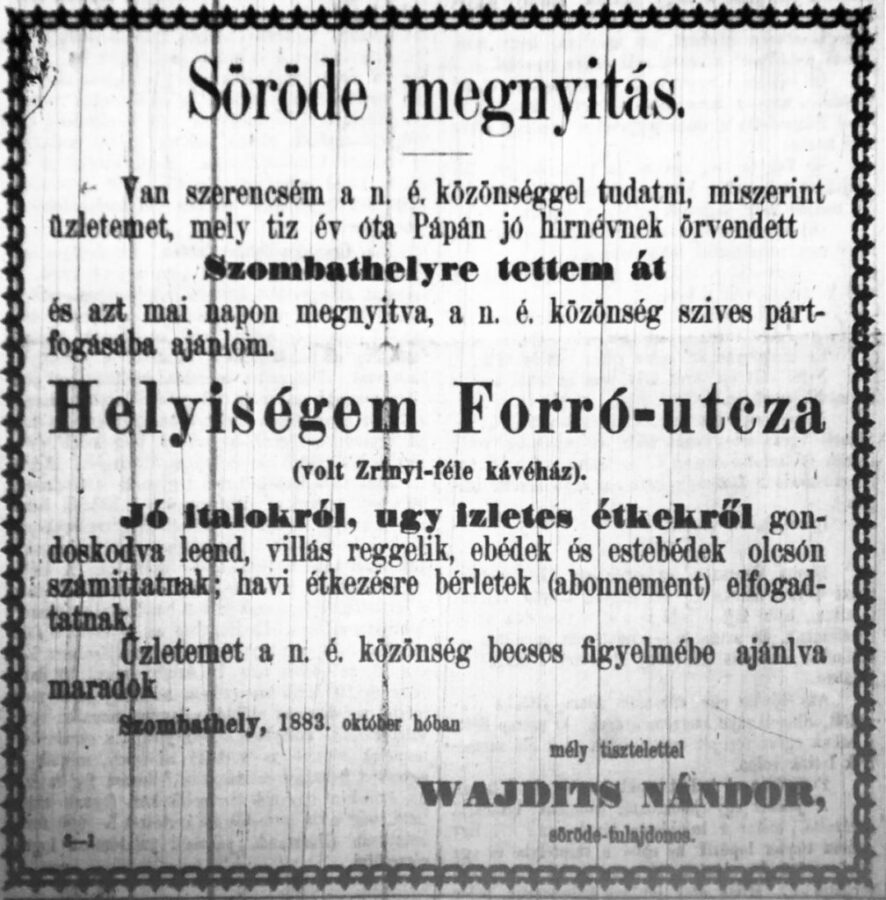 A házban zajló kereskedelmi – vendéglátó tevékenységet egy 1871-es hirdetés bizonyítja elsőként. Itt fontos megemlítenünk a történeti hűség kedvéért, hogy az „Ó-Posta”, „Posta” és „Forró” („Fórró”) utcák a későbbi (1894 utáni) Kossuth Lajos utcát jelölik.
