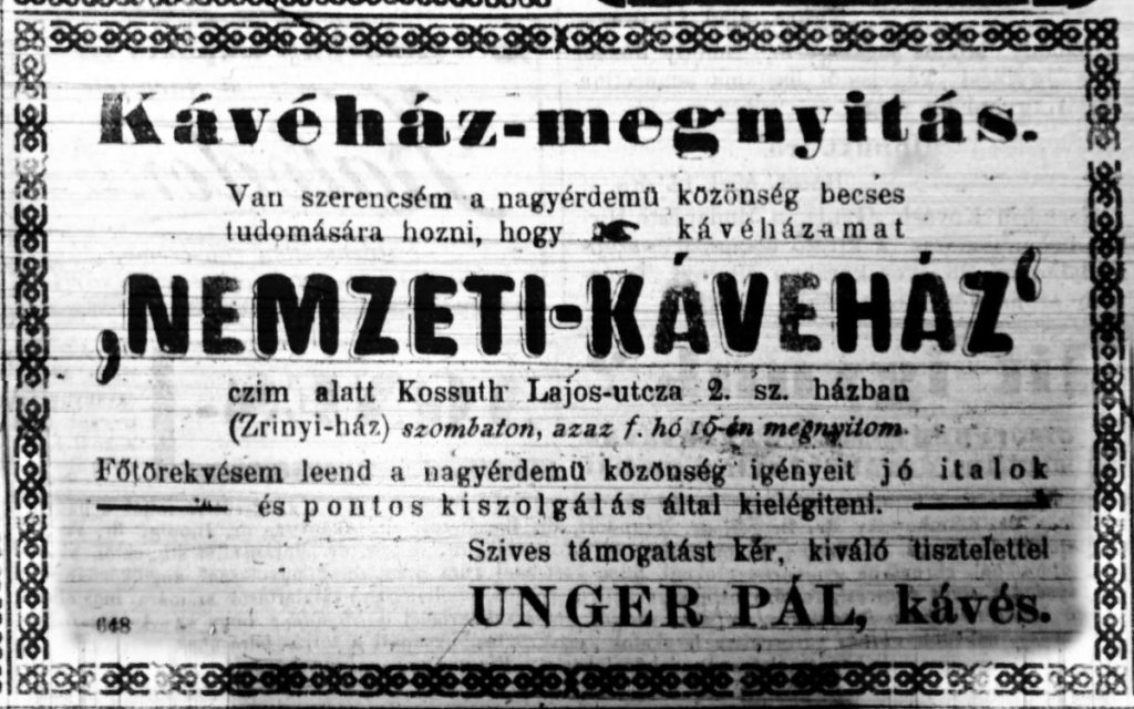 A századvég Szombathely számára hatalmas fejlődést és átalakulást hozott, amit akár azon is lemérhetünk, hogy 1906-ban már a tizedik kávéházként jelzik Unger Pál „Nemzeti Kávéházát” (immár a Kossuth Lajos utcában). A névadás ma is találó lenne (…), de az akkori viszonyokban azért érdekes, mert tiltották az „idegen hatású” cégéreket – talán ennek reakciója volt a kétségtelenül magyaros keresztelés.